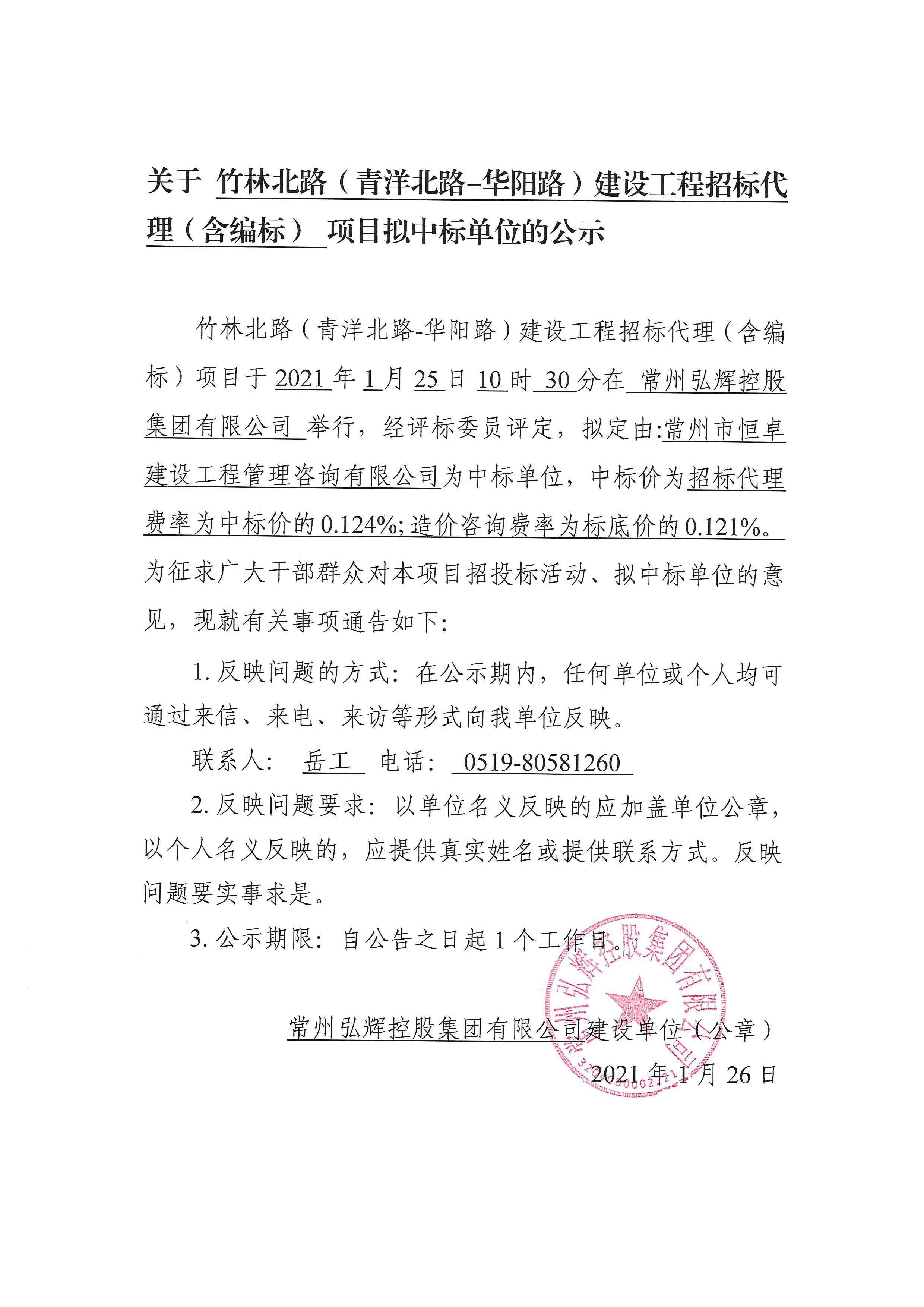 竹林北路(青洋北路-华阳路)建设工程招标代理(含编标)中标公告